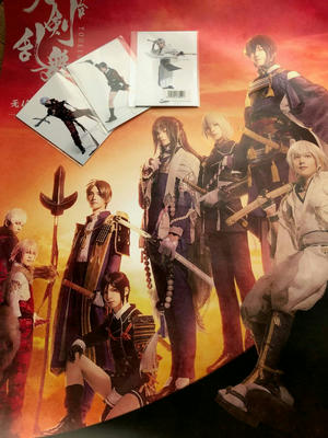 毎日わちゃわちゃしています。 時々付き合っているのでは?と言いたくなるようなイチャイチャっぷり。 とりあえず小助は弄られキャラ。 #穴山 刀ステ无伝6回目を観てきました。 昨日の昼公演。 とりあえず完全に朝型なので基本的に昼しか行きません。 個人的には9時あたりに開演して欲しいくらい。 刀ステも早いもので個人的にあと2回。 寂しい限りです。 昨日もお天気に恵まれ、豊洲からステアラまでの道のりは日傘を差しても暑いくらいでした。 今回は下手10列前後のサイドシート寄り。 前々回からちょっと下がっただけのほぼ同じ席でしたが、やはりサイドは見切れもあるものの近いし出ハケが見えて良い場所です。 では個人的な記録を思いつくままに(順番バラバラ) オープニングの鶴丸の5段跳び。 下から見ると上にも高いのが分かる上にやはり凄い飛距離。 前回の勢い良すぎて転げ落ちそうな感じはなかったものの、今回は高さに魅せられました。 小助は八百屋舞台でバランスを崩して決められず、足が動いてしまって見ている方がちょっとヒヤリ。 転ばずに済んで良かったです。 斜めになっているからバランス取るのが難しそう。 三日月を追う鶴丸の日替わりは「流れ星だ、みんな願い事をしろ!」 清海が「モテたいモテたいモテたい……」 ネタ自体は前にもあったもようですが、この後の境内のシーンで和尚の「罰当たりな!」の後に「だからモテないんですよ!」とネタを拾っていたのが個人的にツボに。 「やだもう〜!」とか、実はここの台詞もちょいちょい違うのが面白い。 无伝は日替わりが多過ぎ。 真田十勇士との対面シーンではちょいちょいと海野あたりに指で挑発する鶴丸。 真田丸では櫓の上からポールを使って滑り降りる十蔵。 この2つはツイッタで見かけていたので知ってはいましたが見えなかったり見逃していたところ。 「コトバヲハナスジカンソコウグンダ!」の鶴丸のジャンプと反り方は改めて見ると凄い。 佐助の反りにも負けない海老反りを披露しています。 漫画みたいなジャンプ。 昨日は両手を振ってきゃっきゃした後、地面を指して挑発も。 阿形も受けて同じことやろうとしたら鶴丸が後ろを向いてしまって残念。 鶴丸は意図的にフードを被ることもありますが、意図せず被ってしまうこともしばしば。 昨日は驚いて前のめりに屈むような所作でフードがぽふんと頭に。 袖もくるりとなって更に背中の鎖も前に。 予期せぬ動きでフードを被ってしまう後ろ姿がめちゃくちゃ可愛い。 真ん丸の白い後頭部が雪見だいふくみたい。 袖をくるりと直してフードを外して鎖も直してと通常仕様に戻るのがなかなか大変。 小助の乾杯は「猫耳をつけた可愛らしいおなごのように」(手で猫耳を付けて可愛い声で)「穴から出て来たモグラのように」(表現し難いモゴモゴこもったような声で)「タンスの角に小指をぶつけた感じで」(クッと息を詰めて)「カンパイ!」 めちゃくちゃ痛そうでした。 鎌坊の武器を振り回す鶴丸は今回は鉄球が十蔵に直撃。 ひっくり返って脛を抱えてめちゃくちゃ痛そう。 鶴丸、自分はともかくまわりを巻き込むのはなかなか酷い。 順番全く違いますが、鶴丸が秀忠に下がっていろ、こっちに来いのシーンではで甕の蓋を開けてここに入れ的な流れが。 因みにこの甕、高台院が話しているシーンで阿形が蓋を開けて何かを放り込んでいました。 昨日は他の役者さんと被ってしまってよく見えなかったのですが、真田丸では阿形もいろいろやっているので気になります。 吽形は櫓の上で干された着物をずっと刀でツンツン。 座り込んで動くぴよぴよ足が凄く可愛い♪ 移動する時も大きな足をぴよぴよぱたぱたひょこひょこ歩く後ろ姿が堪りません。 酒場の日替わりは「望月の発明品は他に何があるんだ?」 「あー……どこでも扉」 「ギリギリだな!」 本当にギリギリ。 鶴丸と十蔵が話をしている後ろでお野菜を十蔵のお皿によける鎌坊が可愛い。 大回転の時は前回初めて阿吽の日替わりを知ったので、三日月を見つつ阿吽探し。 三日月の殺陣は勿論凄いのですが、是非阿吽も探して見て欲しいです。 大回転の前だったか、阿吽揃って刀を投げて見事にキャッチ。 手を繋いで勢いつけて行ってこーいという感じに斬りかかりに行ったり、わちゃわちゃ遊んでいるのに殺陣はめちゃくちゃ速くて強いという。 今まで意識していなかったのですが、阿吽の殺陣も凄いです。 吽形の片手側転とか身体能力の高さも凄い。 大太刀に絡んで反復横跳びをしていたりとにかく自由。 大回転最後は三日月との殺陣をやった後、だーっとセットを駆け上がって阿吽で前後に座って舟の櫂を漕ぐ仕草。 阿吽の動きも浸透しているのか、下手サイドの人は結構阿吽を見ていました。 前回のアイドルばりのダンスとファンサも可愛いかった♪ 阿吽の大回転や日替わりも是非ブルーレイに入れて欲しいです。 阿吽や如水を演じているアンサンブルの方が気になります。 やはり舞台はアンサ