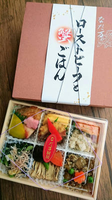そんなわけでなだ万のローストビーフと蟹ごはんのお弁当と、惣菜小箱。